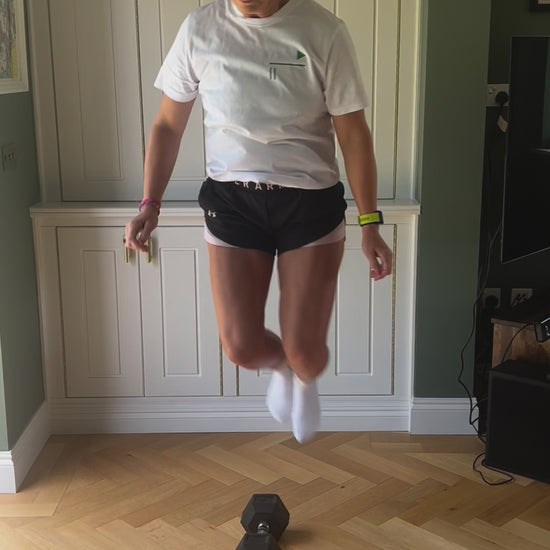 This works the quads, glutes, hamstrings, and calves. Lateral jumps build bone strength and density. In addition to that, as your lower body gets stronger, your balance and joints will improve - it's a good one for knee injury rehabilitation
